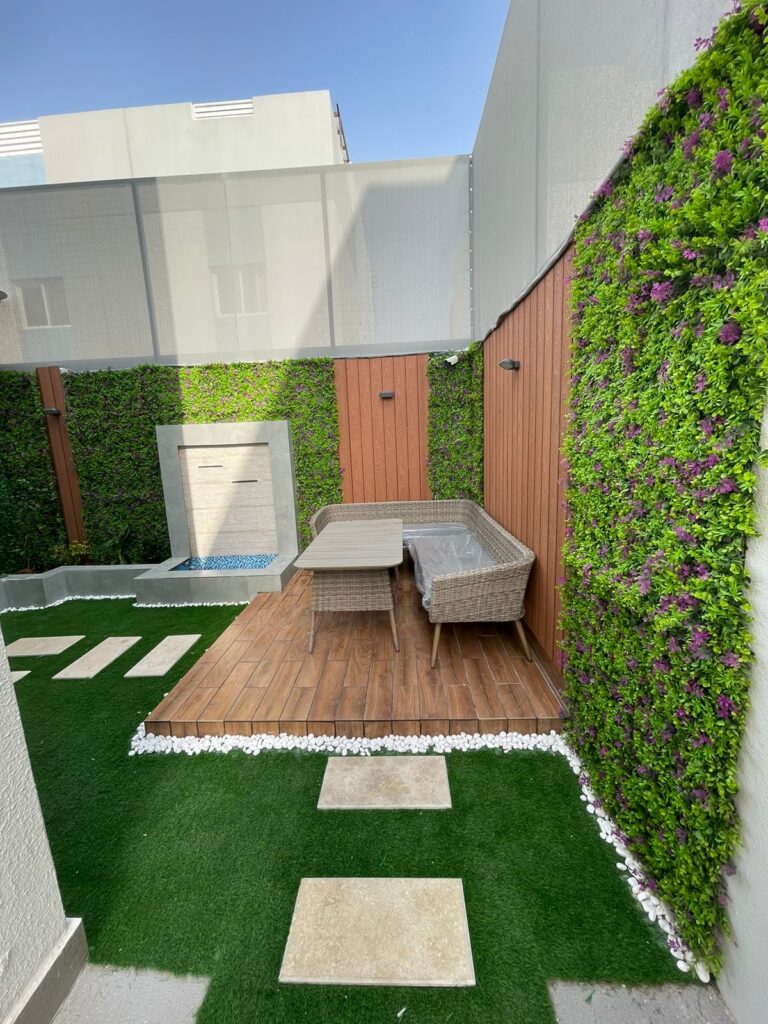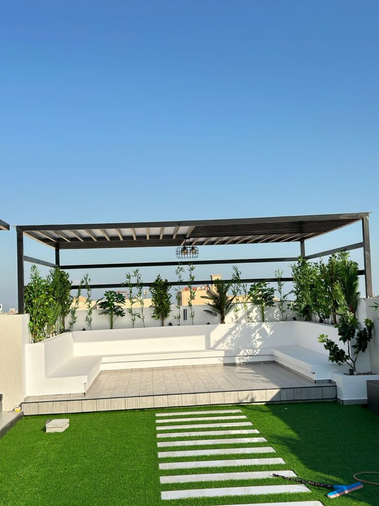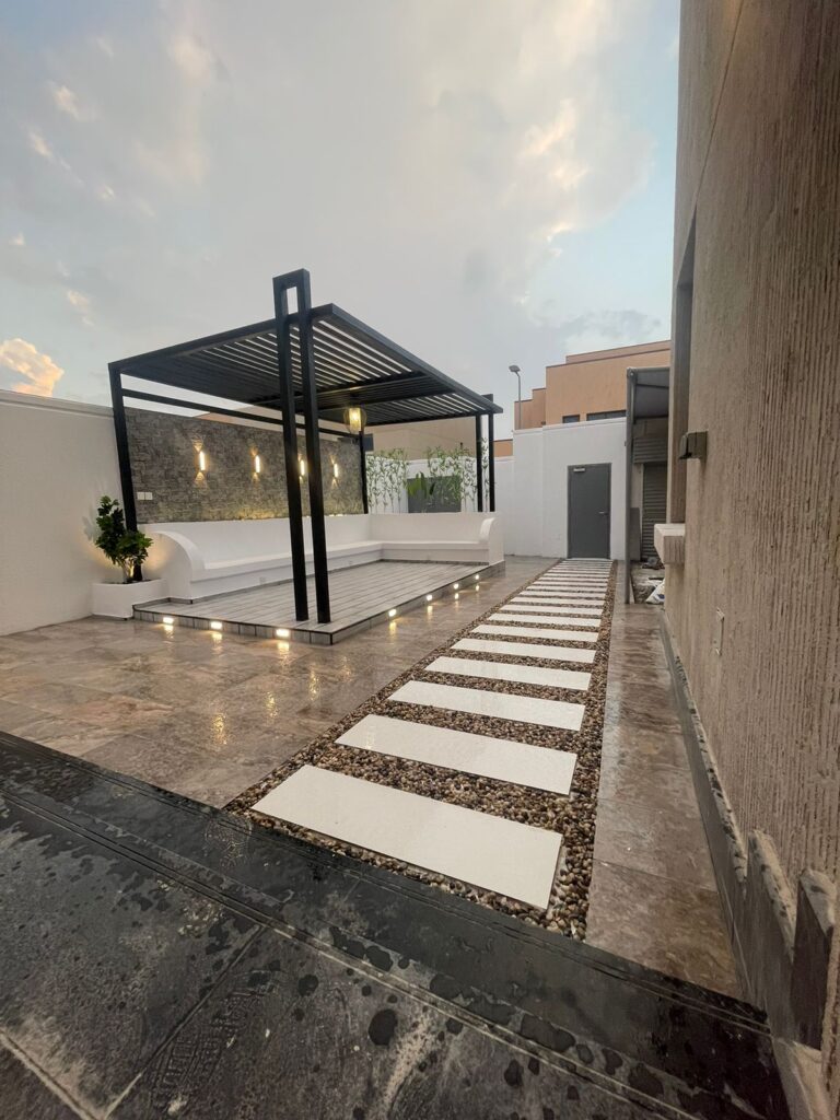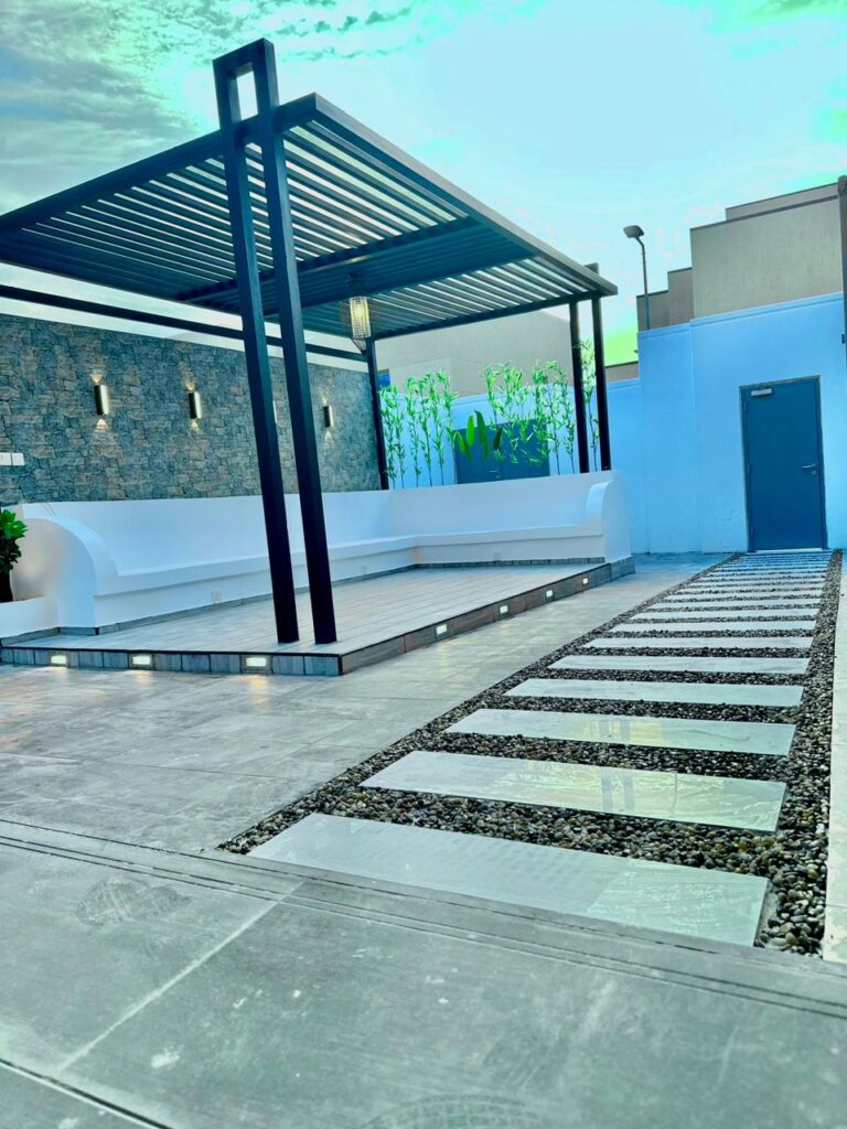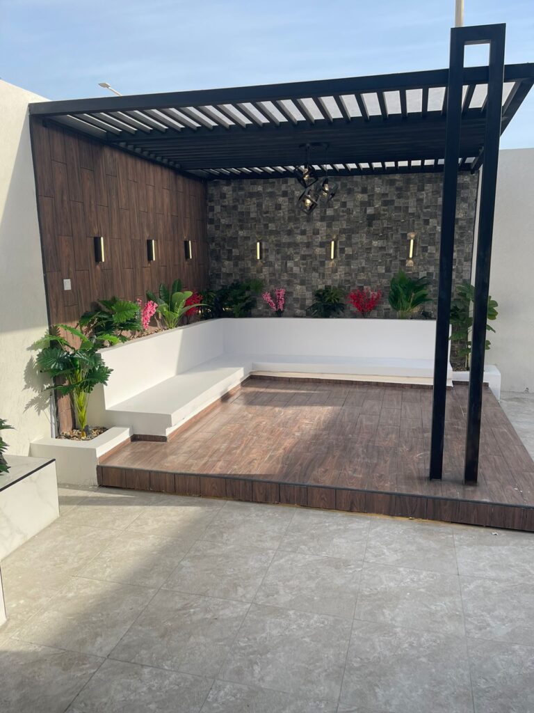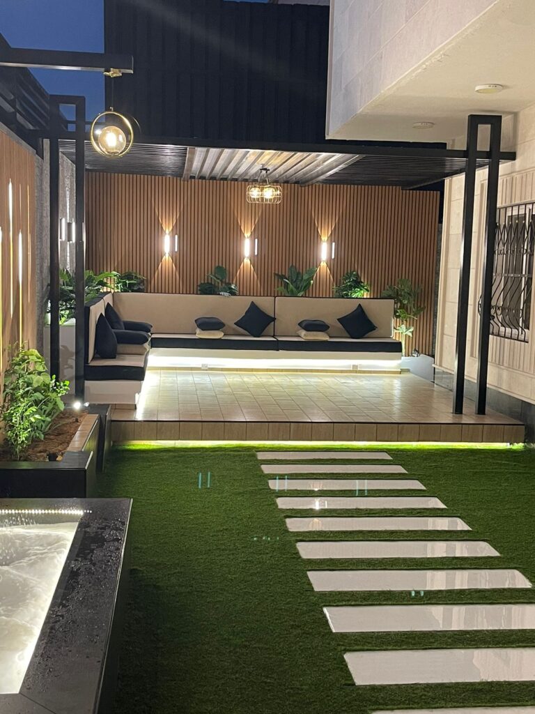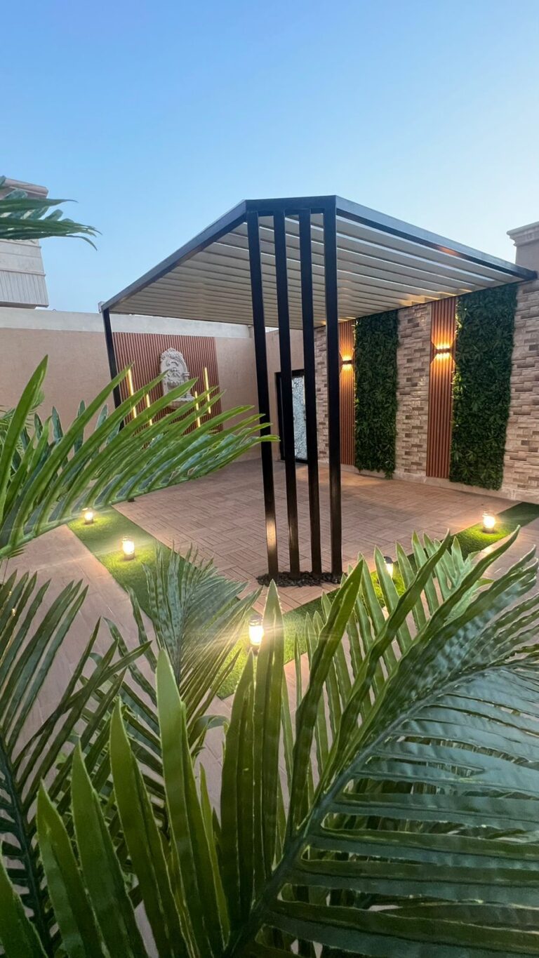 استمتع بأجواء خارجية مريحة تجمع بين الأناقة والخصوصية مع تصاميم زهرة المملكة لتنسيق الحدائق بالأحساء.