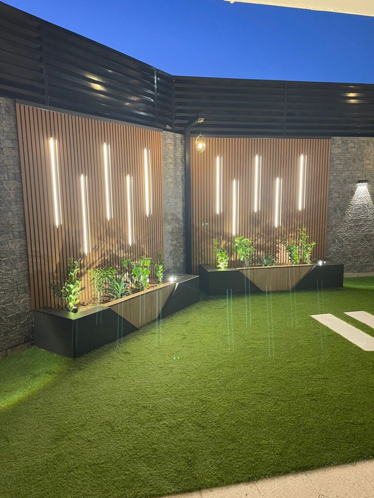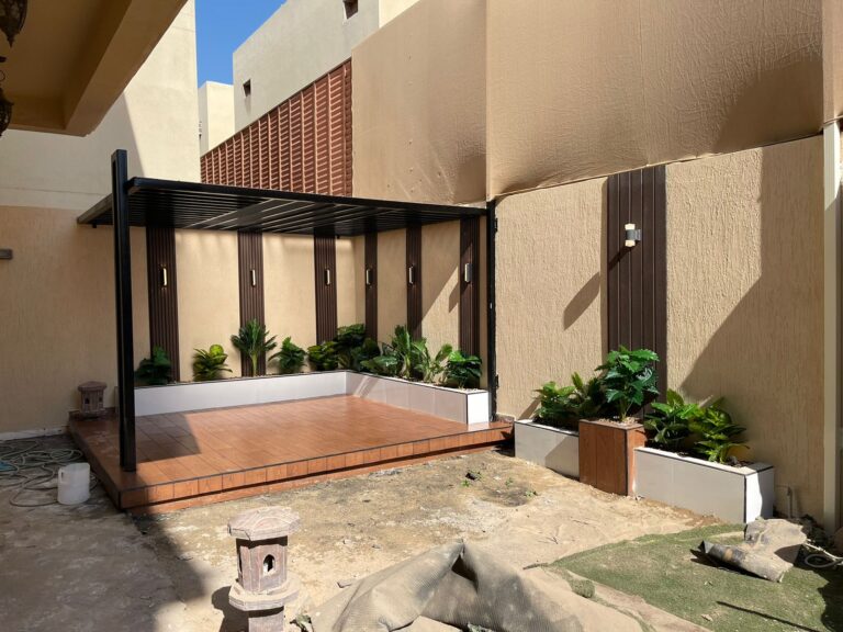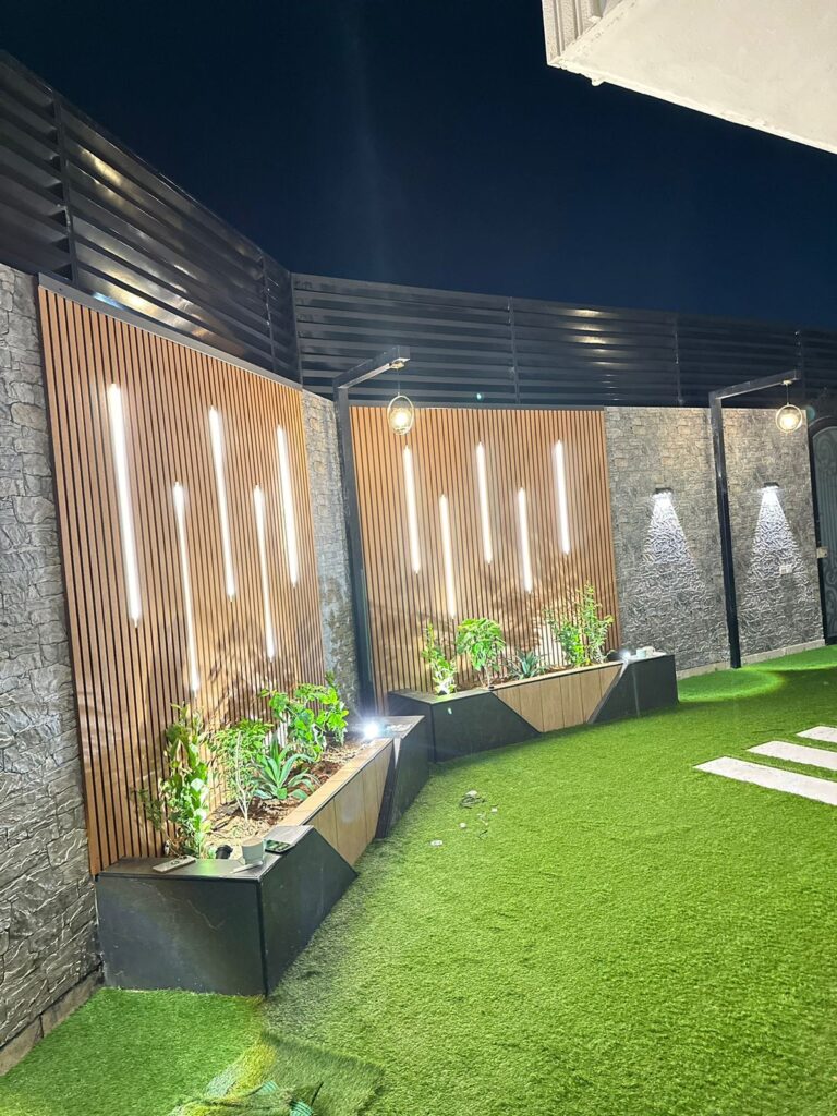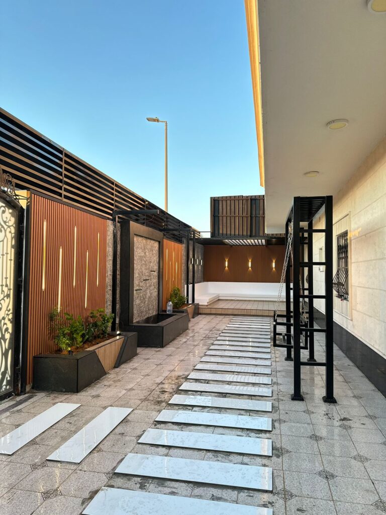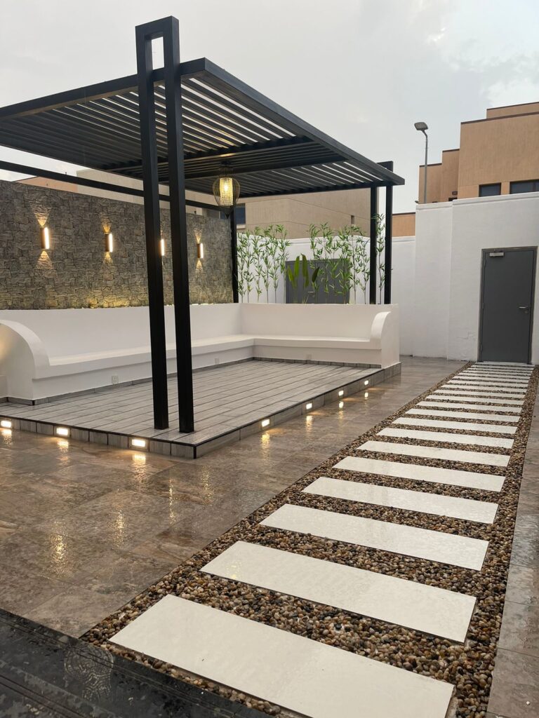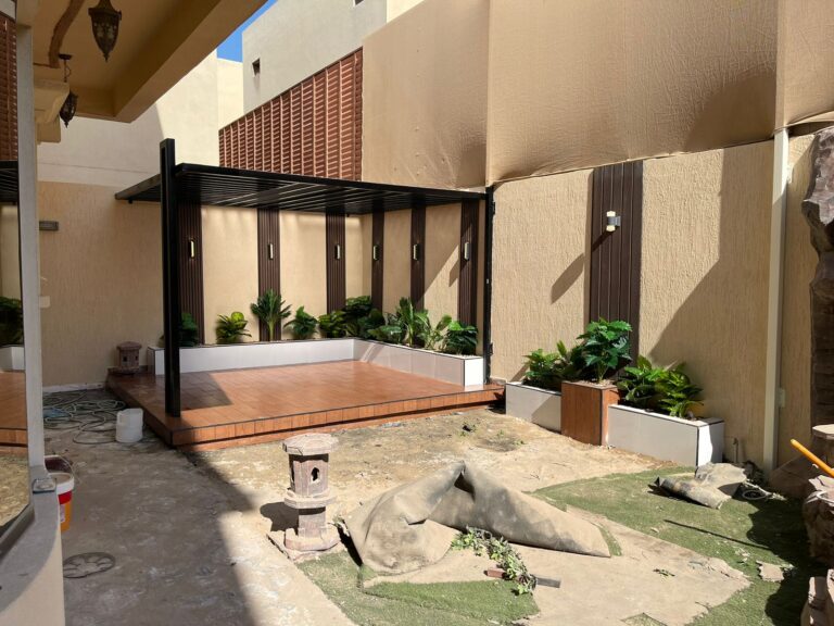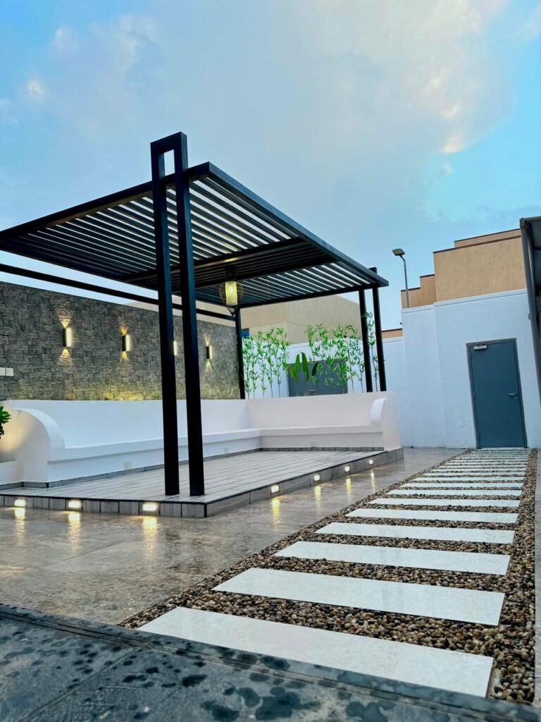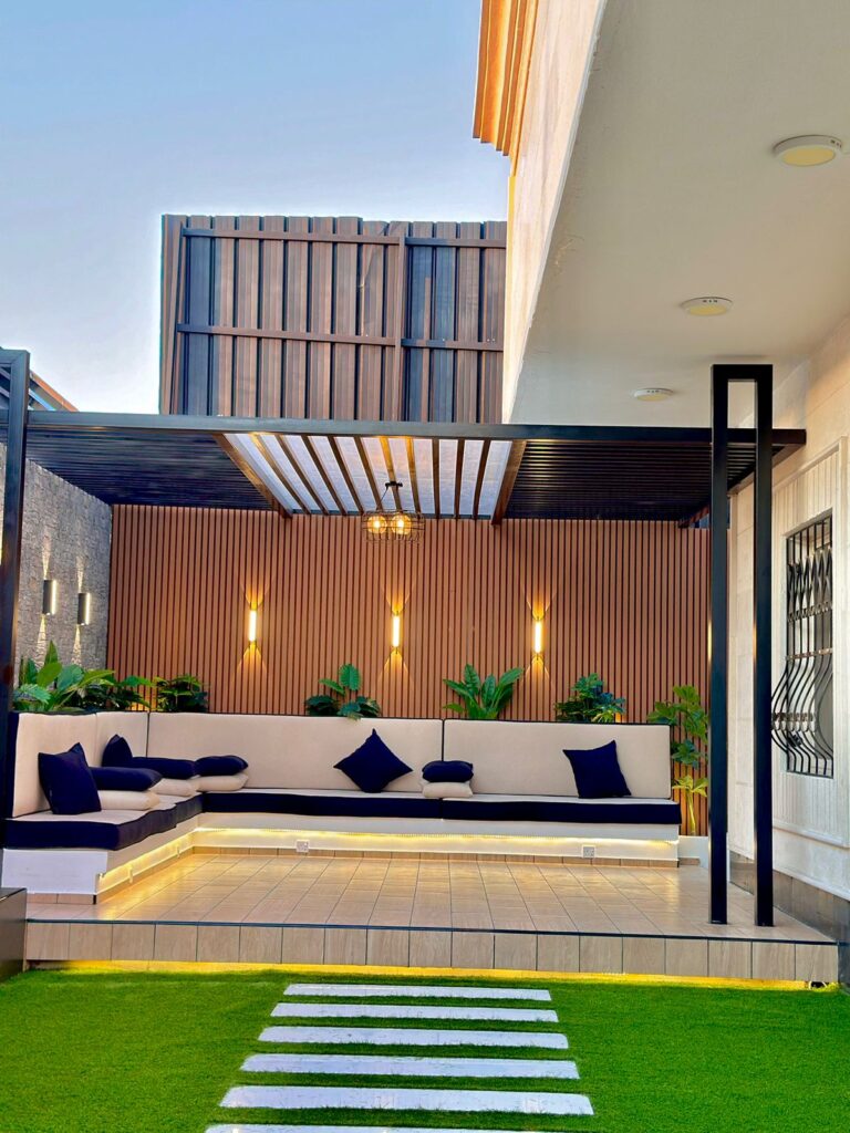 استمتع بأجواء خارجية مريحة تجمع بين الأناقة والخصوصية مع تصاميم زهرة المملكة لتنسيق الحدائق بالأحساء.